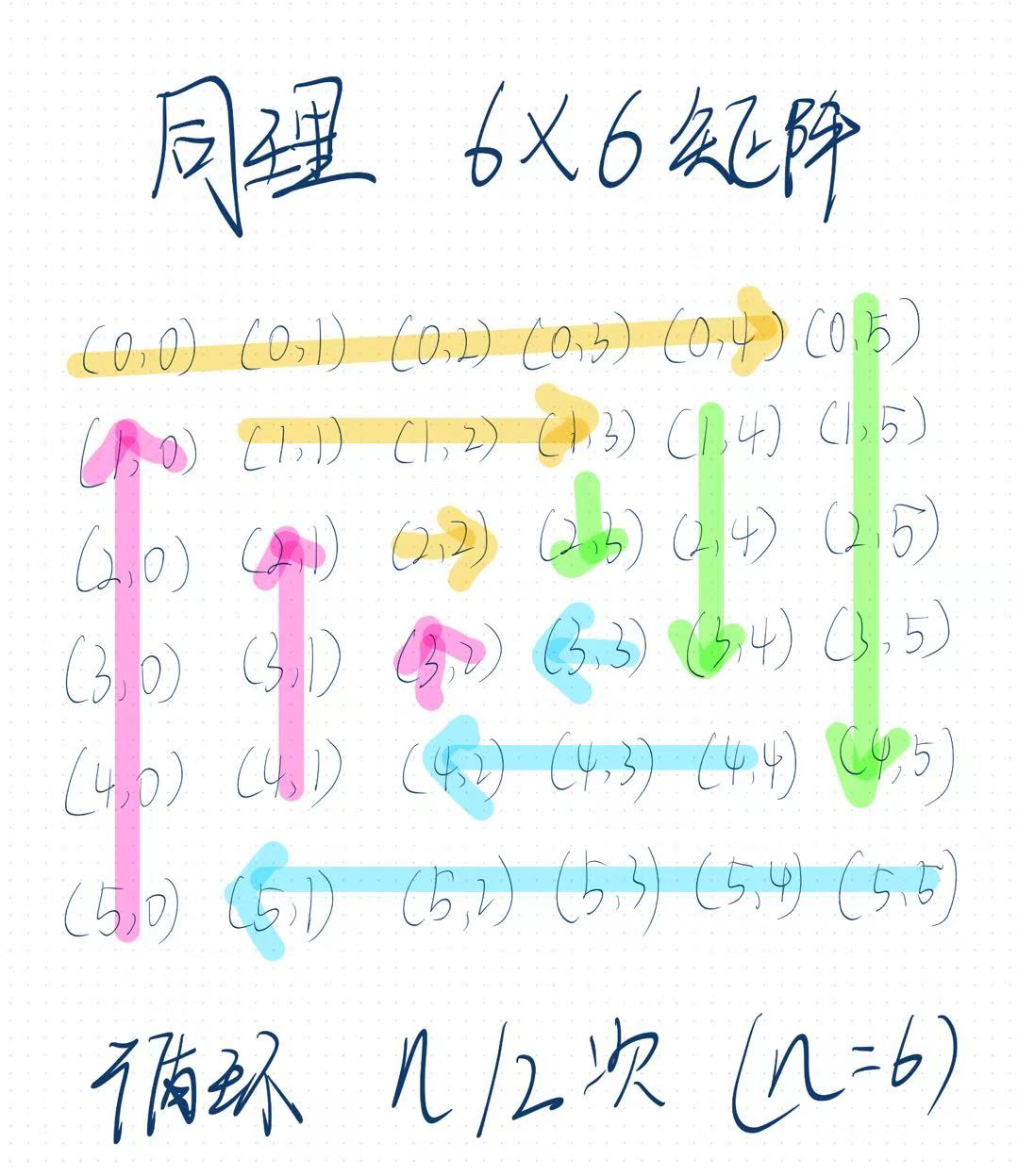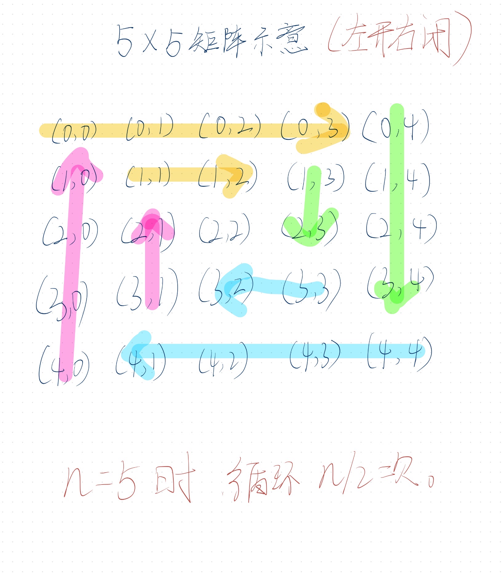 1class Solution { 2 public int[][] generateMatrix(int n) { 3 4 int arr[][] = new int[n][n]; 5 int row = 0, col = 0; // 记录 当前索引的位置 6 int loop = n / 2; // 循环圈数 7 int cir = n - 1; //每一圈的边长 8 int startNumber = 1; // 数组赋值数 9 10 // 以n等于5为例子 11 while (loop-- > 0) { 12 13 //左边到右边的循环 每一次 14 for (int i = 0; i < cir; i++) { 15 arr[row][col++] = startNumber++; 16 17 } 18 19 //上到下 20 for (int i = 0; i < cir; i++) { 21 arr[row++][col] = startNumber++; 22 } 23 //右到左 24 for (int i = 0; i < cir; i++) { 25 arr[row][col--] = startNumber++; 26 } 27 //下到上 读者可以思考循环到这个位置我们的索引是多少 28 for (int i = 0; i < cir; i++) { 29 arr[row--][col] = startNumber++; 30 } 31 32 // 更新索引为下一圈的初始位置 33 row++; 34 col++; 35 cir -= 2; 36 37 } 38 39 //更新奇数矩阵的中心位置元素的值 40 if (n % 2 != 0) { 41 arr[row][col] = startNumber; 42 } 43 44 return arr; 45 } 46}