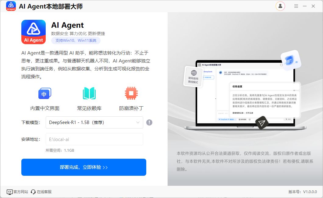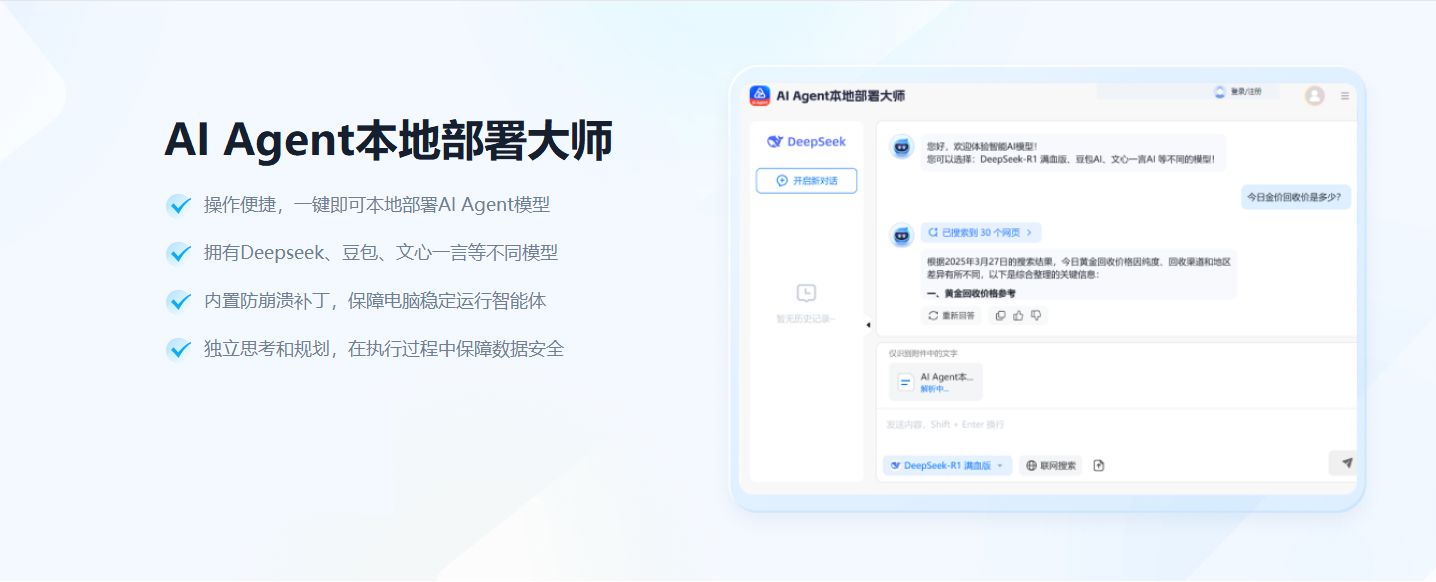 选择工具:AI Agent 本地部署大师是一款专为 AI 模型本地化设计的高效软件,它自带多种主流 AI 模型,包括豆包等。用户可以从官方渠道下载并安装该软件。